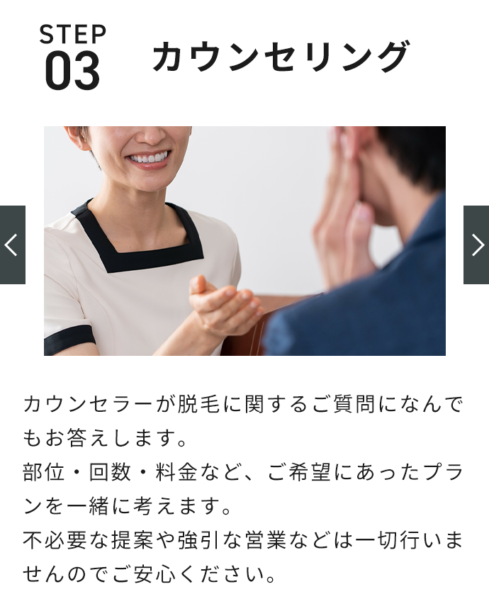 | 施術時間 | 全身脱毛(顔・VIO含む)の場合、着替えを含めて1時間30分を予定しております。 |